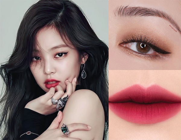 Đôi mắt nâu khói với đường kẻ eyeliner kiểu mắt mèo sắc lẹm là bí quyết không thể thiếu giúp Jennie trông rất sắc sảo và thu hút. Màu son đỏ thẫm tô theo kiểu lòng môi giúp Jennie thêm phần cá tính mà vẫn rất trẻ trung, không bị "dừ", đặc biệt tôn lên làn da trắng.