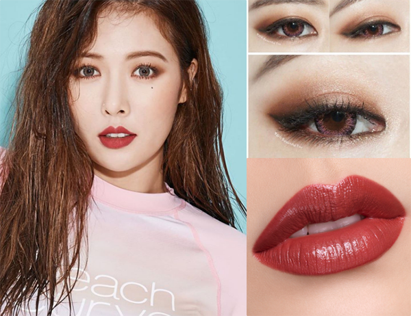 Đôi mắt màu nâu khói cùng cách chuốt mascara kỹ càng giúp đôi mắt của Hyun Ah trông to và sâu hút, bí ẩn hơn. Diện mạo của cô nàng trông vừa quyến rũ lại vừa ngọt ngào như búp bê nhờ cách viền môi hình trái tim sắc nét, tô tông màu đỏ thẫm nổi bật và hút mắt như một trái táo chín.