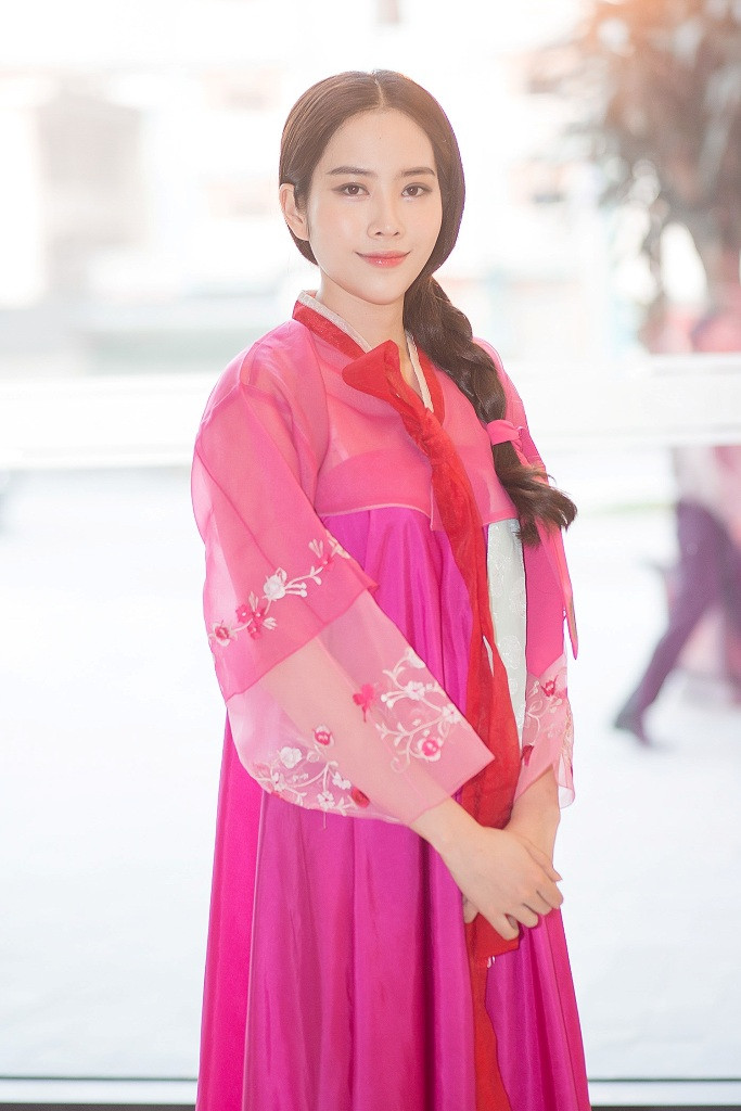 Bộ hanbok màu hồng cánh sen đơn giản, không quá cầu kỳ nhưng đã tạo được sự chú ý và nhận được nhiều lời khen ngợi.