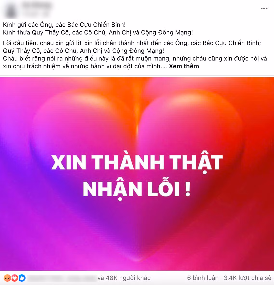 Nam sinh viên gửi lời xin lỗi tới các bác cựu chiến binh, gia đình, nhà trường và cộng đồng mạng, mong có cơ hội sửa sai: “Cháu xin gửi lời xin lỗi chân thành nhất đến các ông, các bác cựu chiến binh... Vì những tác động của thời tiết nóng bức, vì ích kỷ cá nhân để muốn được quay, chụp những tấm hình đẹp khi diễu binh… Cháu đã làm tổn thương đến những con người không tiếc máu xương để chúng cháu có cuộc sống yên bình hôm nay...".