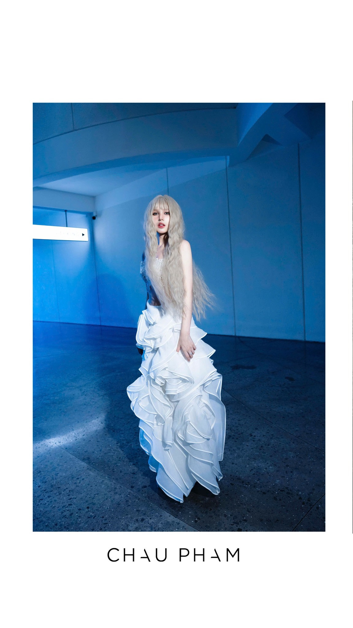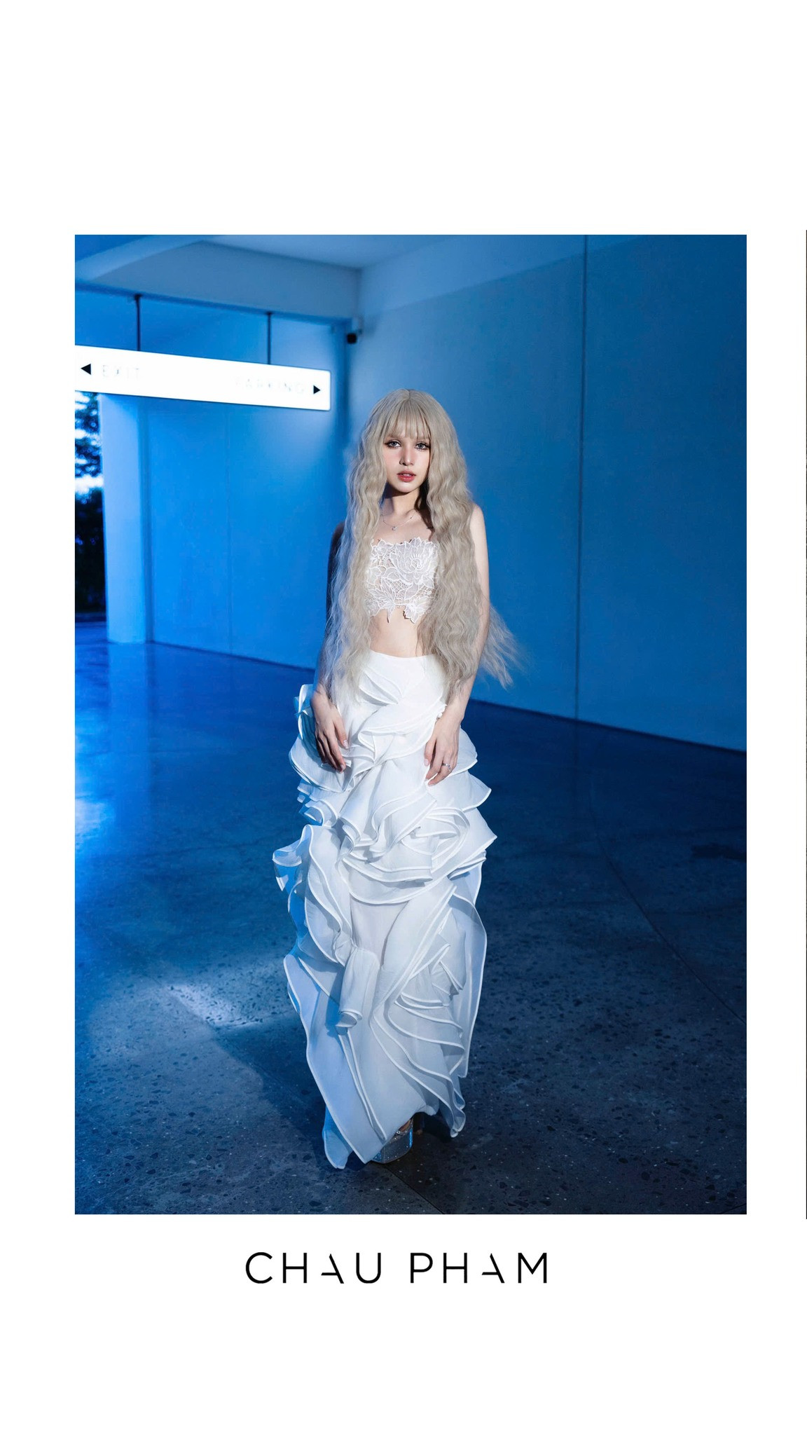 Thiết kế mà hai mỹ nhân Việt Rima Thanh Vy và Xoài Non cùng lựa chọn đến từ BST Thu 2024 của thương hiệu Chau Pham. Bộ trang phục có tông trắng chủ đạo bao gồm phần áo quây chất liệu ren và phần chân váy dài nhiều tầng vải organza bồng bềnh.
