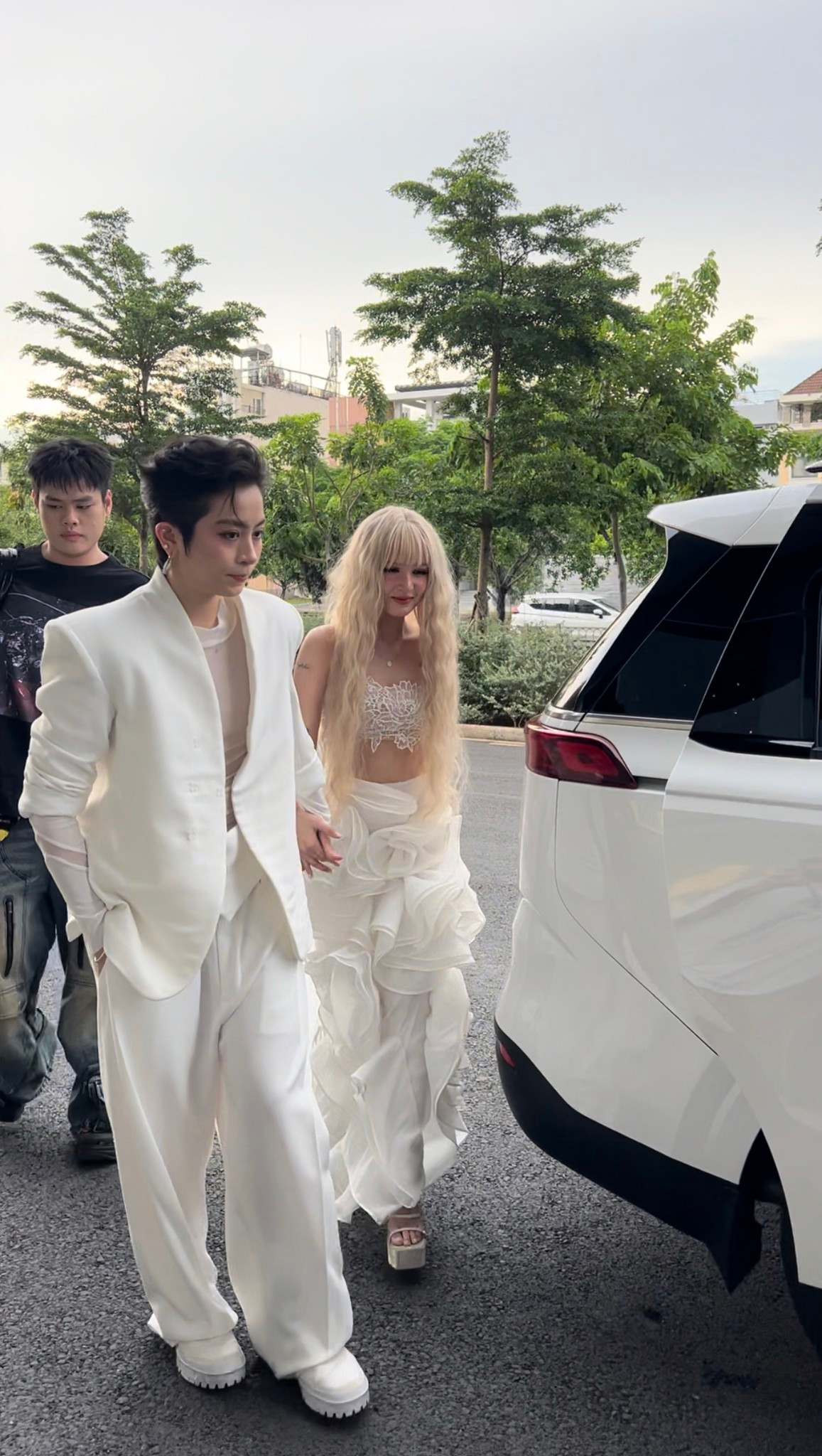 Xoài Non diện thiết kế này xuất hiện tại buổi họp báo ra mắt chương trình Chị Đẹp Đạp Gió 2024, ủng hộ "hàng xóm" Gil Lê. Hotgirl Gen Z diện đầm tông xuyệt tông với Gil Lê, nổi bật nhờ mái tóc bạch kim uốn xoăn bồng bềnh.