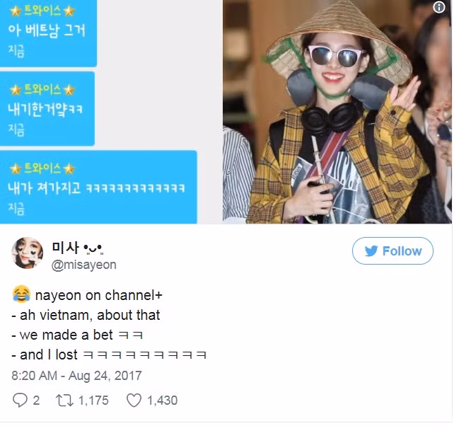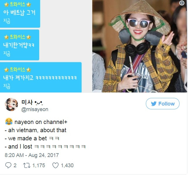 Mãi về sau, Nayeon mới bật mí lý do của bộ trang phục chẳng giống ai này “À, chuyện ở Việt Nam ấy mà, chúng tôi đã có một vụ cá cược. Thế là tôi đã thua”.