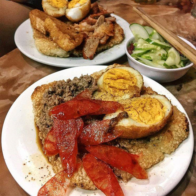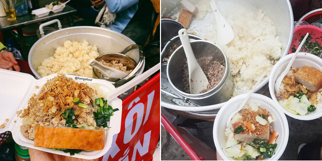 Xôi rán: Nếu thèm ăn xôi nhưng muốn đổi vị mới lạ, bạn có thể tìm đến những quán có bán món rôi rán thơm ngậy. Phần xôi được phơi khô, rán giòn như cơm cháy, ăn kèm cùng nhiều loại topping như thịt kho, trứng kho, xá xíu, gà nấm... Mức giá: 20.000-25.000 đồng/suất. Địa chỉ: Đê La Thành, Hàng Điếu. Ảnh: peashalala.