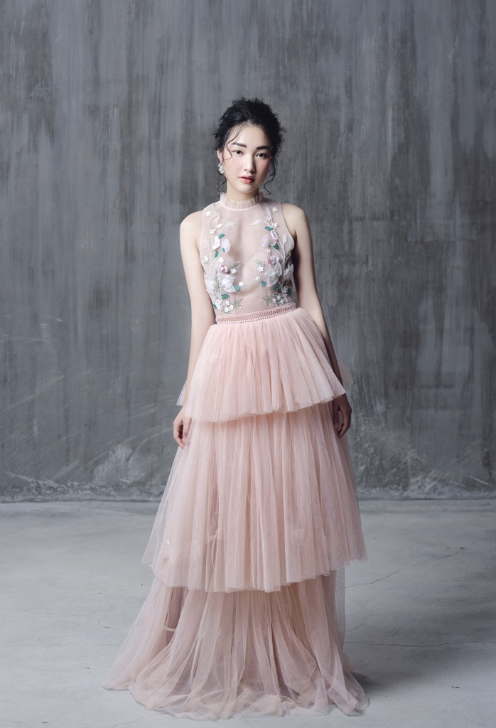 Tông màu hồng pastel đã làm sáng hơn làn da trắng mịn của cô. Chiếc váy 2 lớp, bên ngoài là chất liệu vải lưới đan mảnh cùng họa tiết hoa đính nổi, bên trong kín đáo với váy dày dặn nhưng vẫn mang lại sự thoải mái cho người mặc.