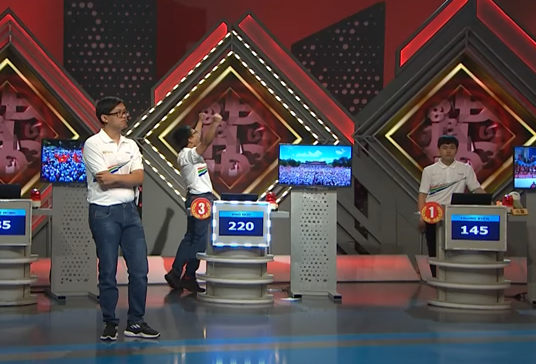 Với 30 điểm này, nếu Nguyên Phú trả lời đúng, cậu sẽ có cơ hội "lội ngược dòng" và trở thành Quán quân, nhưng Phú Đức đã nhanh tay hơn. Dù trả lời sai, bị trừ 15 điểm, nam sinh THPT chuyên Quốc học - Huế vẫn giành chiến thắng với tổng 220 điểm.