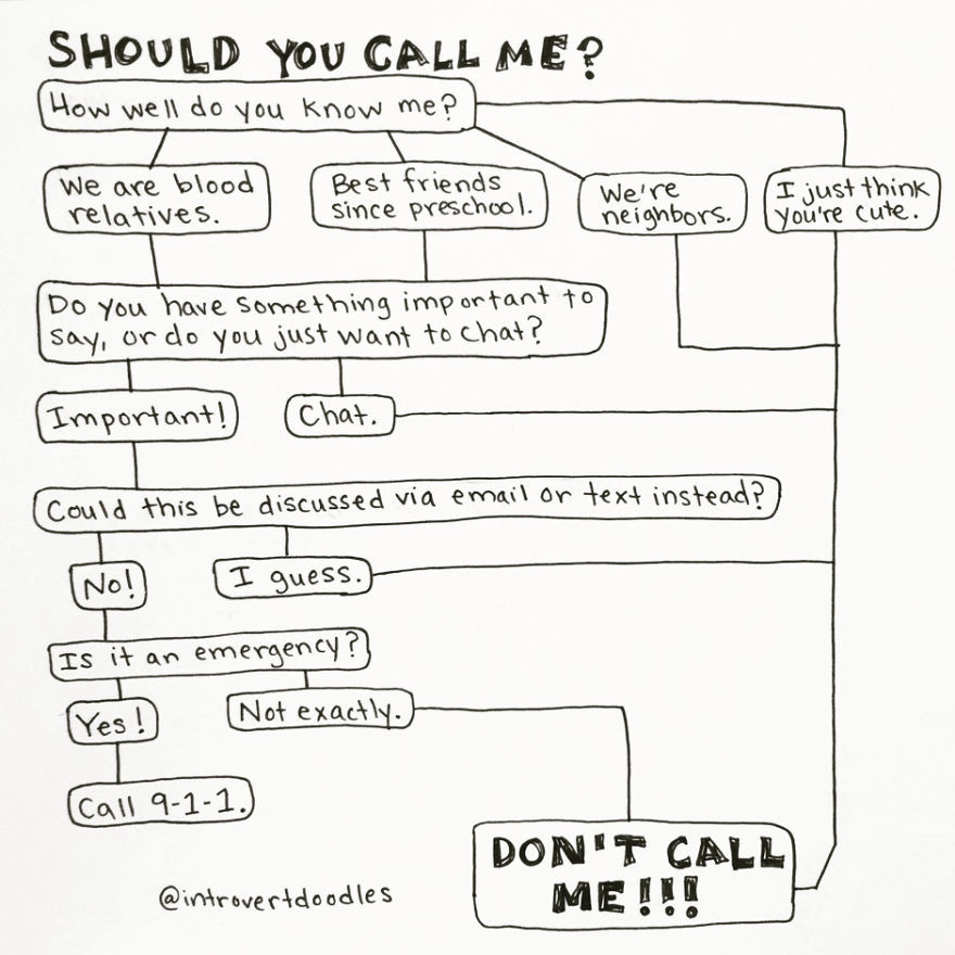 Khi bạn gọi điện cho người hướng nội, bạn phải xem xét thật kỹ mức độ thân thiết của cả hai. Bởi introvert hình như ai cũng khó tính và chán ngấy việc giao tiếp điện thoại nên cẩn thận đừng để hiện ra chữ “Đừng gọi tôi!” to đùng nhé!