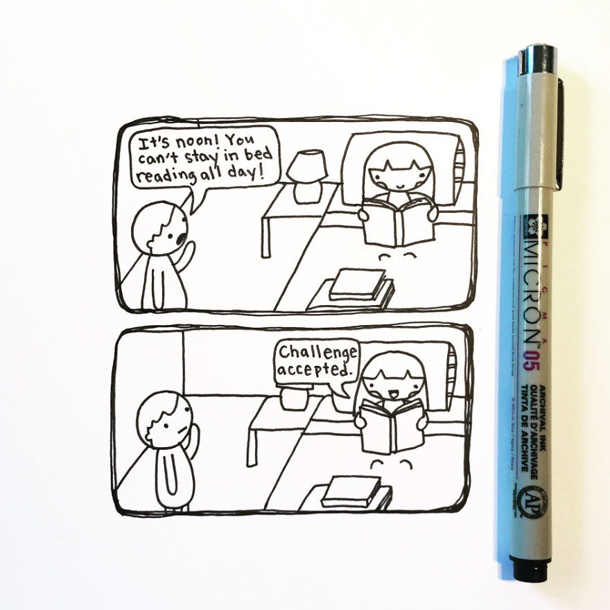 Cô nàng hướng nội thích nằm dài ở nhà đọc sách, kể cả khi bị mẹ than phiền, nàng vẫn lắc đầu từ chối ra ngoài. Đơn giản, chỉ vì thử thách “đọc sách cả ngày” đã được nàng chấp nhận dễ như ăn cháo.