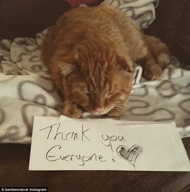 Sau khi được chữa trị, Benben được đưa đến bệnh viện BCSPCA với hi vọng nó sẽ được ai đó nhận nuôi. Nhưng với rất nhiều chấn thương như vậy, cơ hội của Benben là rất nhỏ và bác sĩ chuẩn bị lên lịch để cho Benben một cái chết nhân đạo. Thế nhưng khi bác sĩ thú y Sandy biết được về Benben, cô đã quyết định mình sẽ cưu mang chú mèo tội nghiệp này. Và kể từ khi được nhận nuôi, Benben đã có những biến chuyển đáng kể: Chú bắt đầu đi lại, một điều tưởng chừng như không thể, và ăn thêm rất nhiều.