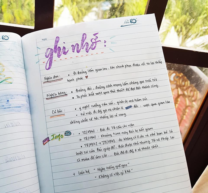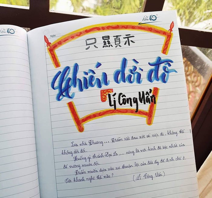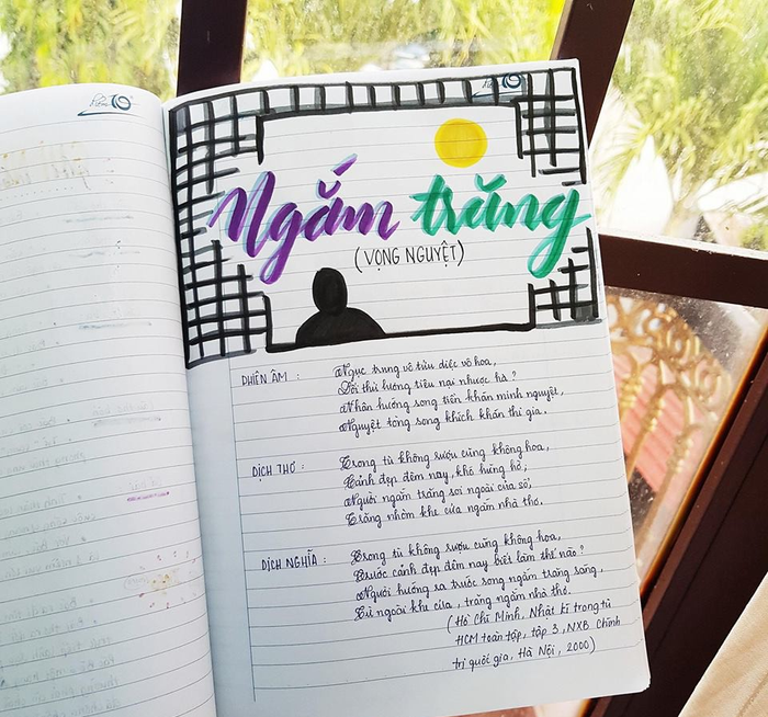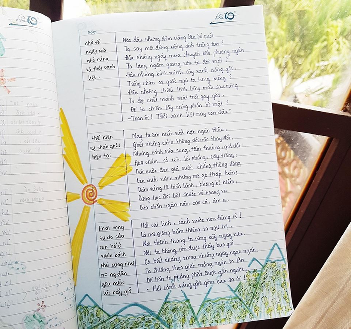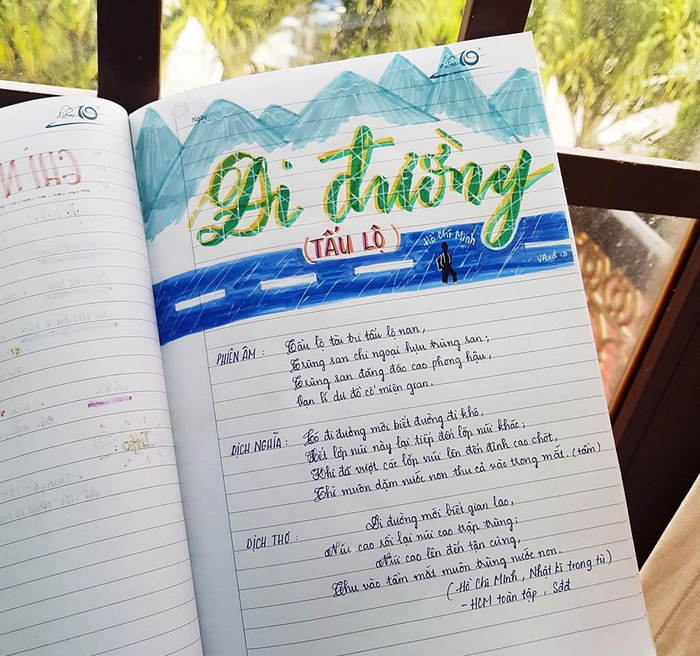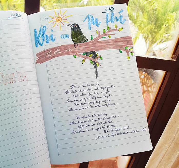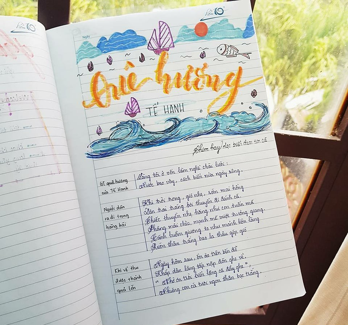 "Mình thích nhất là tựa bài Quê hương của Tế Hanh, vì chỉ "quẹt quẹt" vài nét nhưng nhìn rất xinh. Mình còn vẽ thêm thuyền, mặt trời, biển, tôm cá cho thêm sinh động. Mỗi bài, mình đều chọn viết một phông chữ khác nhau để bắt mắt, dễ nhìn. Khi nhìn vào cuốn vở, mình cảm thấy rất hứng thú khi học và nhớ bài rất lâu. Đây cũng là một cách xả stress của cô gái yêu thích "màu mè" giống mình" - Vân Anh chia sẻ.