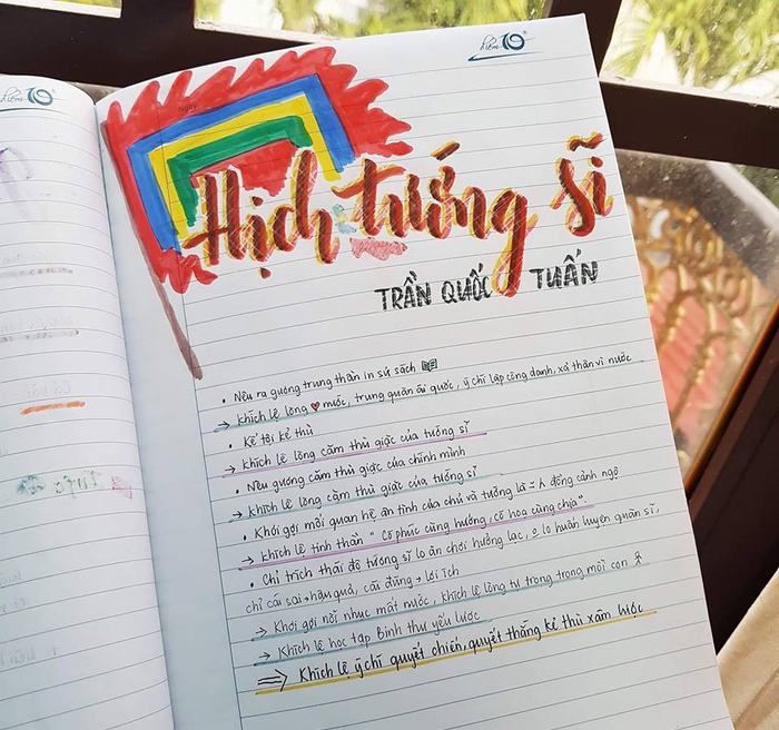 Vân Anh thường chọn vẽ tựa đề vào đầu tiết học. Khác với cuốn vở ghi vở ở lớp, quyển vở thú vị này cô bạn soạn riêng để dễ học bài. Mỗi khi đọc bài xong, bạn lại liên tưởng đến một hình vẽ nào đó nên dùng bút vẽ lại. Xong phần tựa, Vân Anh tóm gọn lại nội dung và phân tích từng đoạn. Bạn còn chừa thêm một trang để viết phần ghi nhớ.