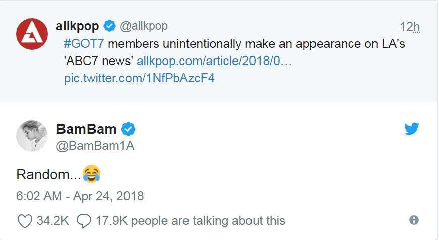 Chính thành viên Bambam của GOT7 cũng rất hào hứng với việc nhóm bỗng dưng được lên tivi. Bambam đã retweet một bài đăng về chuyện này cùng lời bình luận “Trùng hợp quá”. Quả thực là một sự trùng hợp vô cùng thú vị mà.