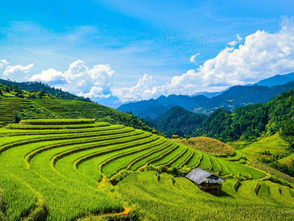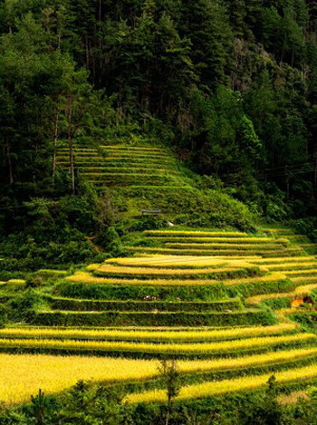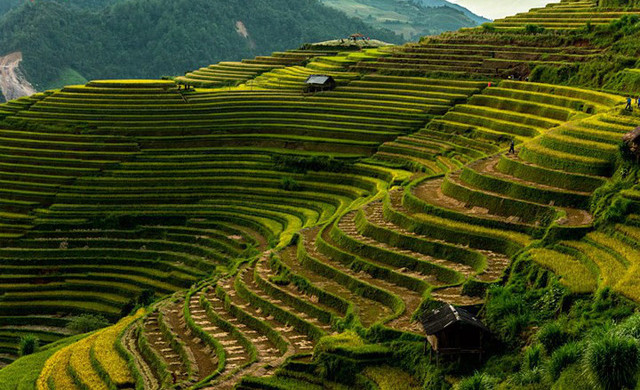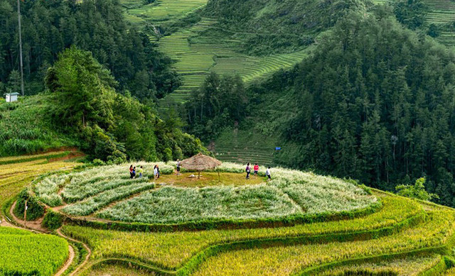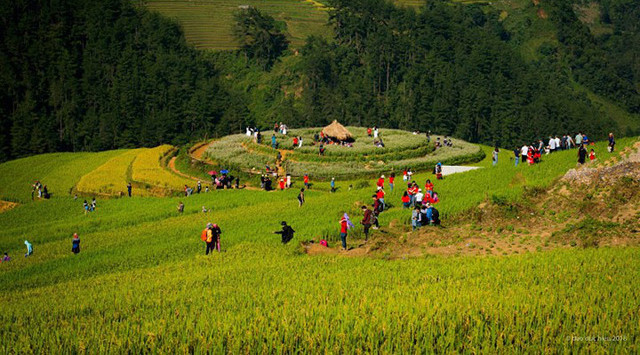 Từng thửa ruộng bậc thang chập chùng, uốn lượn như những cơn sóng vàng óng ả trong nắng vàng hớp hồn những ai có mặt nơi đây.