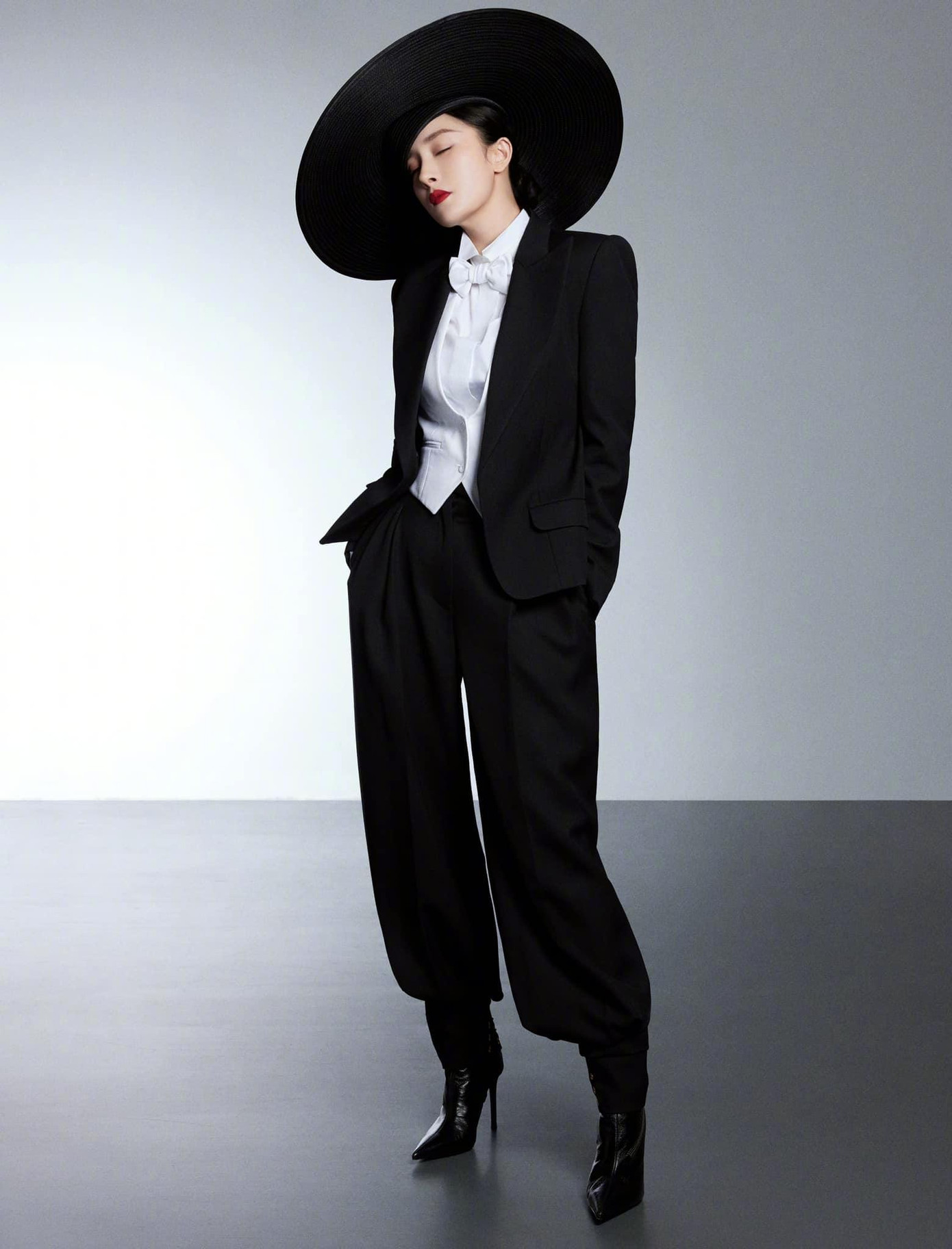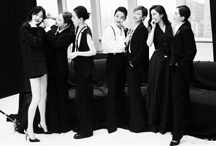 Ở look thứ 2 khi chụp ảnh cùng hội chị em “soái tỷ”, Dương Mịch mặc một chiếc quần tây ống rộng, áo ghile đen, tóc xoăn xõa tung cực kỳ nữ tính.