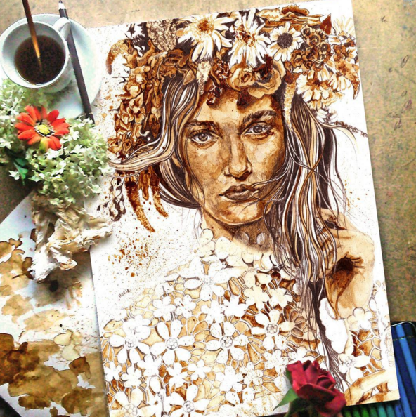 Nuriamarq là một họa sĩ khá có tiếng trên cộng đồng Twitter (@nuriamarq). Những bức tranh của Nuriamarq độc đáo vì được vẽ bằng một loại màu vẽ đặc biệt: Nước cà phê.