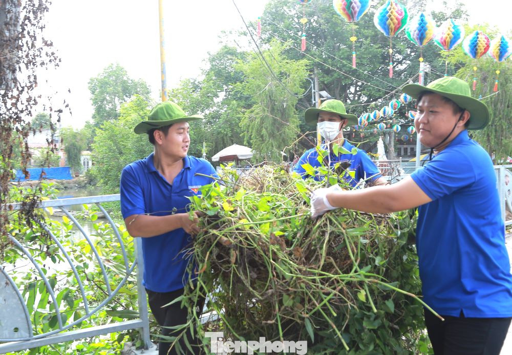 | “Liên quân 3 màu áo” với hàng trăm đoàn viên thanh niên và người dân địa phương thực hiện thu dọn rác thải, phát quang bụi rậm, vớt cỏ dại, lục bình trên kênh rạch tại tỉnh Bình Dương. |