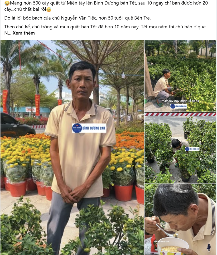 Tại Bình Dương, câu chuyện của chú Tiếc, người mang hơn 500 cây quất từ miền Tây lên bán, đã gây xúc động mạnh trên mạng xã hội. Sau 10 ngày đứng chợ, chú chỉ bán được hơn 20 cây. Ánh mắt bất lực của chú nhìn những cây quất khiến nhiều người đồng cảm.