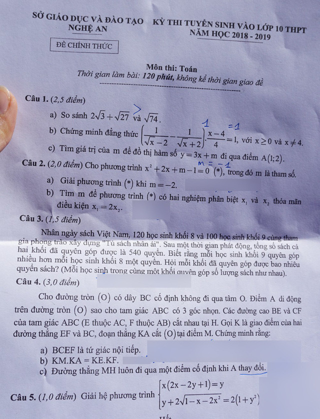 Đề thi môn Toán kỳ thi tuyển sinh lớp 10 năm học 2018 - 2019 tại Nghệ An.
