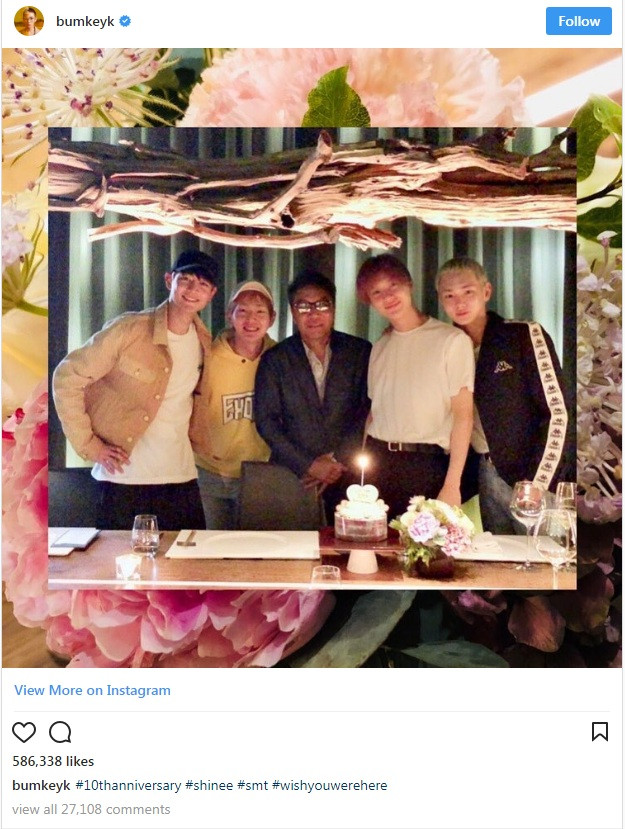 Đặc biệt nhất là trên Instagram cá nhân, Key đã đăng tải tấm ảnh bốn thành viên chụp cùng giám đốc Lee Soo Man, kèm theo một loạt hashtag như #10thanniving #shinee #smt #wishyouwherehere. Và ai cũng biết rằng lời nhắn nhủ #Ước gì anh có ở đây là dành cho Jonghyun, chàng trai thứ 5 của SHINee nay đã ở một nơi rất xa. Và chắc hẳn từ trên trời cao, Jonghyun sẽ luôn dõi theo và cầu mong mọi điều tốt lành đến với SHINee.