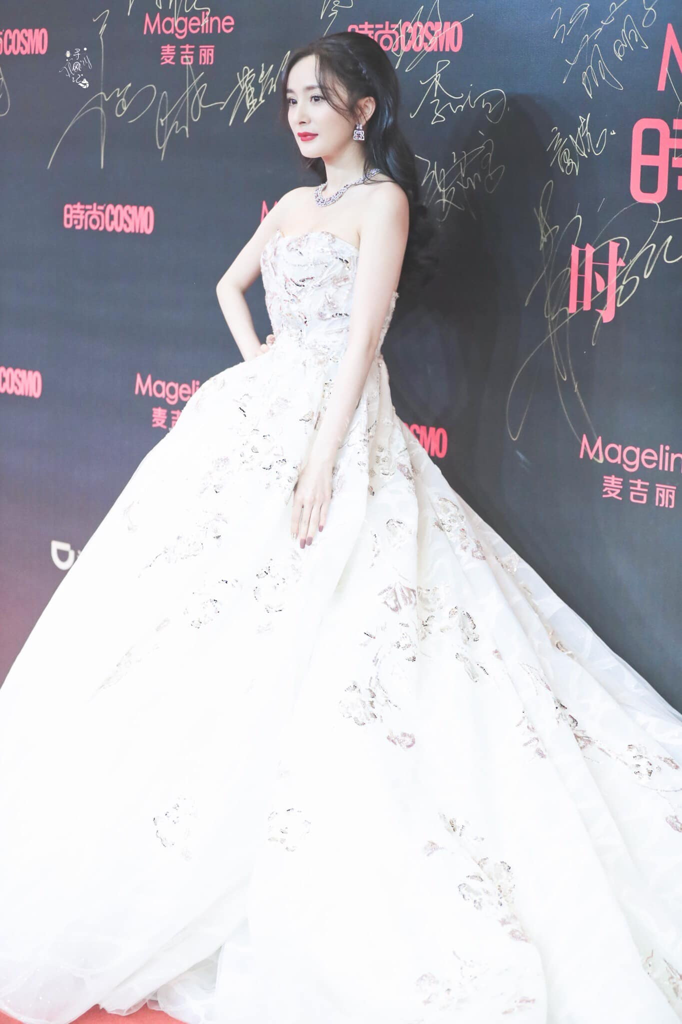 Trong đêm hội Cosmo vừa diễn ra, Dương Mịch diện hai bộ váy khác nhau, một lộng lẫy và một thanh nhã. Khi xuất hiện trên thảm đỏ, Dương Mịch ngay lập tức trở thành tâm điểm chú ý với bộ váy trắng bồng bềnh như một đám mây.