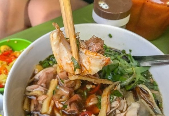 Đây là món ăn mới được các tín đồ ăn uống thủ đô phát hiện ra trong một góc nhỏ ngay gần chợ Đồng Xuân. Bánh phở là loại nguyên bản, chưa qua chần hay chiên gì đâu nhé, khi chúng mình đến là được dọn ra và ăn ngay. Bát nước chấm đậm vị xì dầu lan tỏa, bên trong ứ ự thịt gà, rau dăm. Gà được thái lát mỏng, vừa ăn, thịt gà vàng óng hấp dẫn. Bát nước dùng nóng hổi, ngập hành xanh ngắt dùng dể ăn kèm.