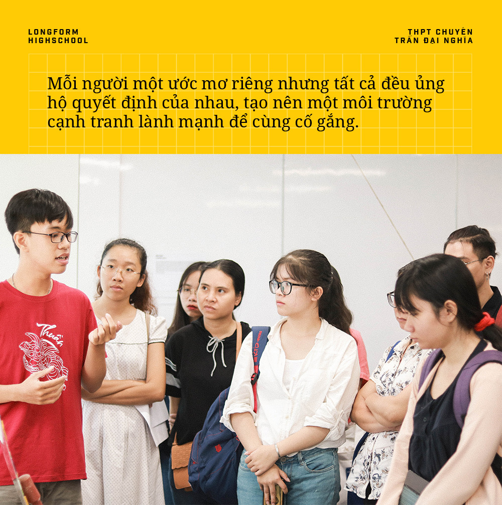 Trong trường, có bạn sẽ tham gia đội tuyển học sinh giỏi, có bạn thì theo đuổi ước mơ làm nhiếp ảnh gia, nghiên cứu lịch sử Việt Nam, tập tành làm YouTuber hay trở thành đội trưởng đội bóng đá của trường. Mỗi người một ước mơ riêng nhưng tất cả đều ủng hộ quyết định của nhau, tạo nên một môi trường cạnh tranh lành mạnh để cùng cố gắng. Mọi cố gắng của tụi mình, dù là huy chương vàng học thuật hay là nút vàng YouTube, đều được ghi nhận và khuyến khích hết mình.