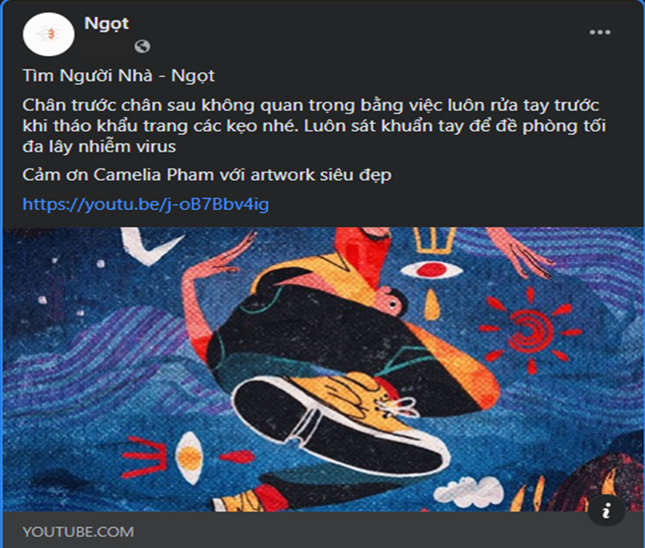 Ngọt band giới thiệu ca khúc mới Tìm người nhà kèm lời nhắc nhở mọi người: “Chân trước chân sau không quan trong bằng việc luôn rửa tay trước khi tháo khẩu trang các Kẹo nhé! Luôn sát khuẩn tay để đề phòng tối đa lây nhiễm virus.”