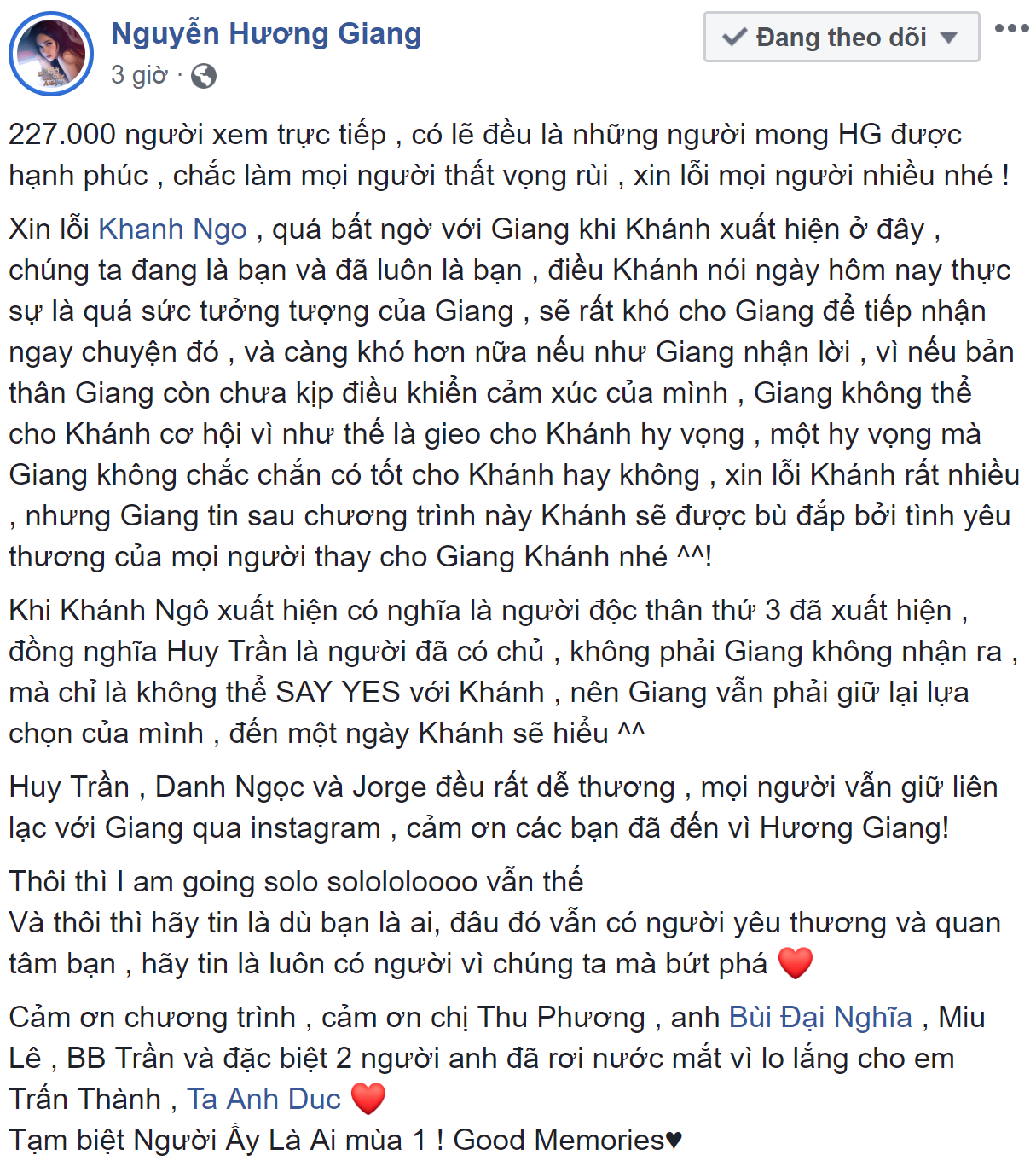 Không ít người hâm mộ bày tỏ sự tiếc nuối trước sự lựa chọn của Hương Giang cũng như gửi lời động viên đến Khánh Ngô. Và ngay sau khi kết thúc chương trình, Hương Giang đã lý giải cho quyết định của mình trên trang cá nhân.
