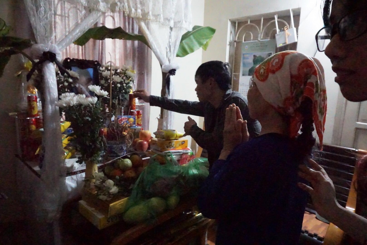 Hai người nhận được giác mạc của bé Hải An đến thắp nhang cảm ơn cô bé và gia đình.