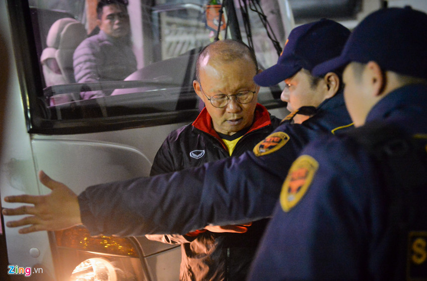 Huấn luyện viên Park Hang-seo từ chối ký tặng nhưng cổ động viên nam vẫn đuổi theo. Bảo vệ lập tức can thiệp để đưa thầy Park lên xe an toàn.