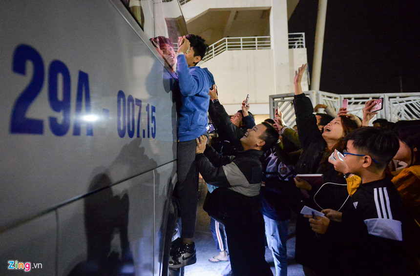 Tối 14/12, hàng chục người hâm mộ chờ sẵn ở xe buýt của đội tuyển Việt Nam tại sân vận động Mỹ Đình với mong muốn nhìn thấy các cầu thủ trước trận chung kết AFF Cup 2018.