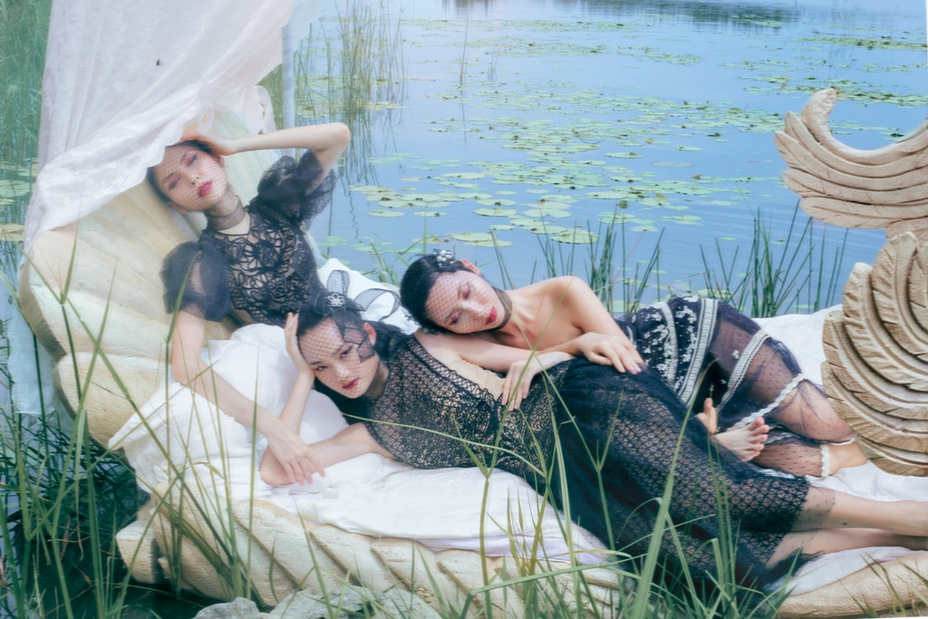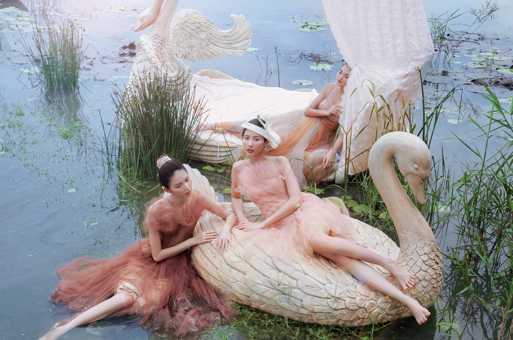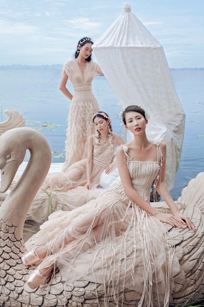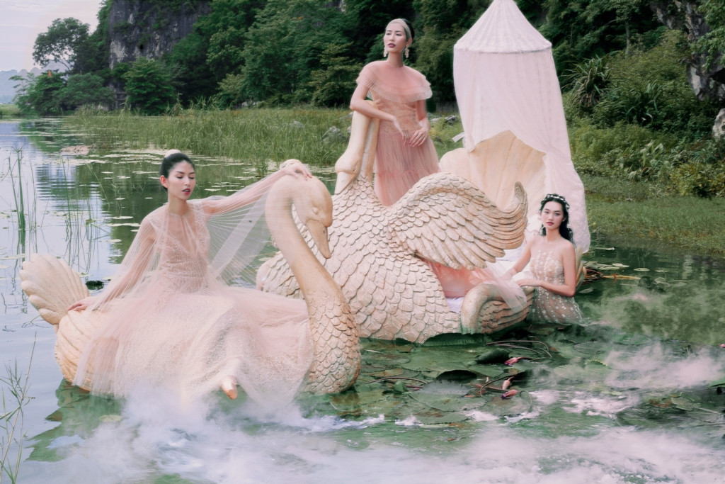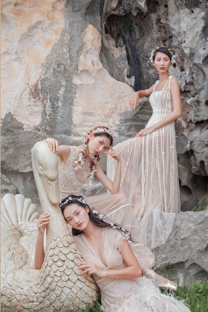 Bộ sưu tập còn có chất liệu tuyn lưới, ren mỏng tạo những khoảng hở trên thân váy, tôn nét gợi cảm của người diện. Điểm nhấn nằm ở phần họa tiết ren thêu sắc sảo, tạo độ mềm mại cho trang phục. Ba nữ người mẫu tạo dáng giữa không gian thơ mộng, trong trẻo của nước và núi đá vôi trên đầm Vân Long, Ninh Bình.
