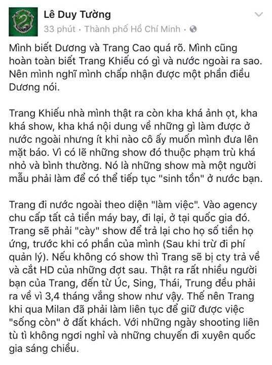 Lê Duy Tường khẳng định: Trang Khiếu đi diễn tại nước ngoài là do tự lực chứ không phụ thuộc vào ai như lời phát ngôn của Thùy Dương. "Chuyến đi Mỹ đầu, là tiền của Trang để dành suốt nhiều năm và Trang trả giá cho nó bằng cách - hết sạch. Chuyến đi London sau này là tiền nàng dành dụm và tranh thủ cơ hội từ những tour của NTK trong nước. Chuyến đi Ý là việc casting thành công cho các agency lớn của Ý và họ tài trợ trước (Trang cũng phải trả sau). Trang đi làm, gom góp, đi nước ngoài, tận dụng nguồn thu nhập về VN làm thiết kế. Đó là chu trình không ngừng nghĩ của cô."