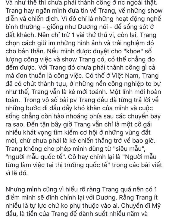 Những dòng chia sẻ của anh Tường là khá đúng thời điểm, bởi lẽ, ít nhiều người hâm mộ của Trang Khiếu nói riêng hay những người mẫu khác được Thùy Dương nhắc tới nói chung cũng đang băn khoăn, mong muốn có câu trả lời xác đáng. Nhiều ý kiến tỏ ra đồng tình với anh Tường, bởi lẽ, trên thị trường người mẫu quốc tế khắt khe, chỉ có tài năng và nỗ lực mới giúp những người mẫu tồn tại và phát triển. Không riêng gì Trang Khiếu mà tất cả những người mẫu Việt đang trên hành trình "vươn mình" ra thế giới đều đã và đang phải nỗ lực không ngừng.