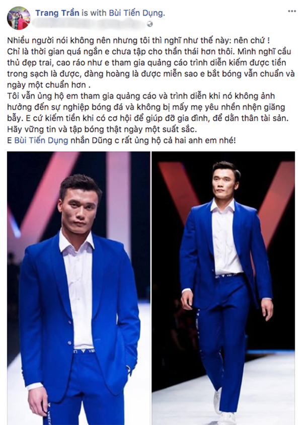 Trước đó, cựu người mẫu Trang Trần cũng thắng thắn lên tiếng phản bác những quan điểm "ném đá" Bùi Tiến Dũng. Cô cho rằng việc kiếm tiền từ nghề người mẫu hay đi sự kiện, quảng cáo của bất cứ ai hay chàng thủ thành này không hề đáng bị chỉ trích. "Chỉ cần trong sạch, đàng hoàng là được, miễn sao em bắt bóng vẫn chuẩn và ngày một chuẩn hơn. Em hãy cứ kiếm iền khi có cơ hội để giúp đỡ gia đình, dằn thân tài sản. Hãy tự tin và tập bóng ngày một xuất sắc" - Cựu người mẫu Trang Trần chia sẻ.