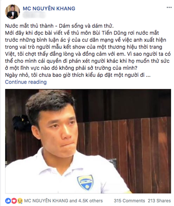 MC Nguyên Khang bày tỏ cảm xúc: "Đọc bài viết về thủ môn Bùi Tiến Dũng rơi nước mắt trước những bình luận ác ý của cư dân mạng về việc anh xuất hiện trong vai trò người mẫu kết show của một thương hiệu thời trang Việt, tôi chợt thấy đắng lòng và đồng cảm với em…