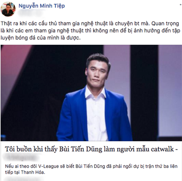 Cùng với đó, nam diễn viên Minh Tiệp cũng thể hiện quan điểm ủng hộ Bùi Tiến Dũng trên trang cá nhân rằng: "Thật ra khi các cầu thủ tham gia nghệ thuật là chuyện bình thường mà. Quan trọng là khi các em tham gia nghệ thuật thì không nên để bị ảnh hưởng đến tập luyện bóng đá của mình là được".