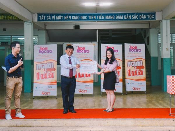 Thầy Hiệu Trưởng đại diện nhận phần học bổng trị giá hơn 10 triệu đồng từ Trung tâm Anh ngữ ACET để trao lại cho học sinh xuất sắc nhất của trường