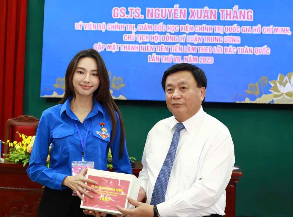 Cũng trong khuôn khổ Đại hội Thanh niên tiên tiến làm theo lời Bác lần thứ VII - năm 2023, Hoa hậu Thùy Tiên cùng hơn 400 đại biểu khác có cơ hội gặp mặt Đồng chí Nguyễn Xuân Thắng, Ủy viên Bộ Chính trị, Giám đốc Học viện Chính trị quốc gia Hồ Chí Minh, Chủ tịch Hội đồng Lý luận Trung Ương.