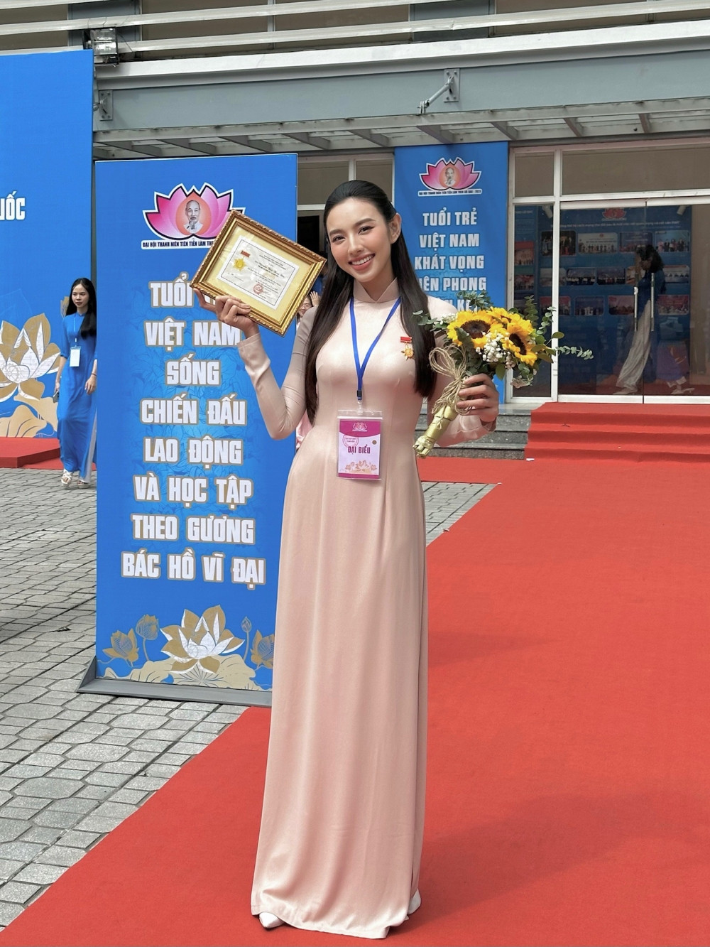 Sáng ngày 27/9, Hoa hậu Thùy Tiên đã có mặt tại Lễ tuyên dương Thanh niên tiên tiến làm theo lời Bác toàn quốc lần thứ VII, năm 2023. Trong tà áo dài Việt, người đẹp tự hào chụp hình ảnh kỷ niệm cùng bằng khen Thanh niên tiên tiến làm theo lời Bác.