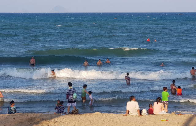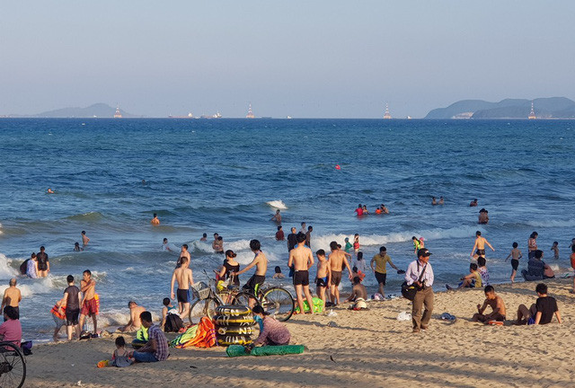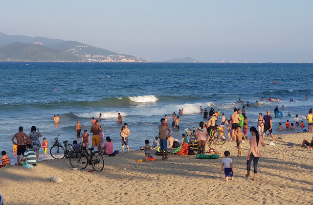 Bãi biển phía đông đường Trần Phú Nha Trang đông nghịt du khách và người dân tắm biển, chiều 28/4.