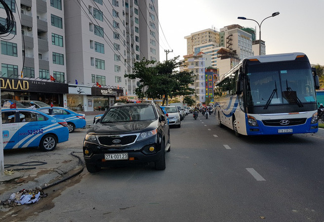 Đường Trần Phú chiều 28/4 tấp nập ô tô đưa đón du khách đi tham quan.