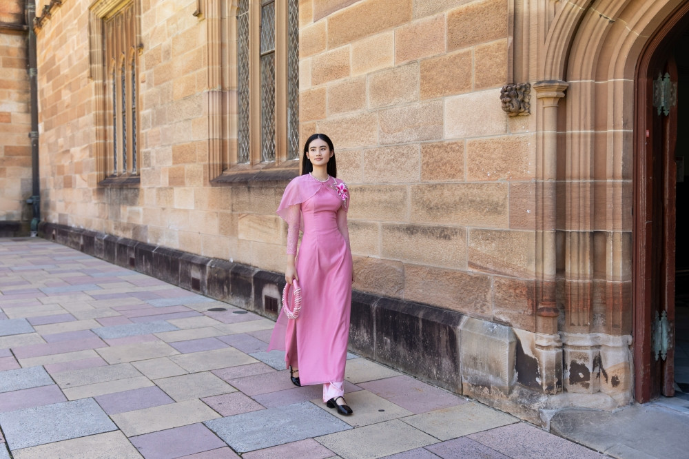 Hình ảnh cô sinh viên Việt Nam nền nã trong tà áo dài hồng truyền thống sải bước tại một trong những không gian trường đẹp nhất nước Úc, như nói lên tiếng lòng của những sinh viên xa nhà, thương nhớ Tết quê hương nhưng lại không thể về.