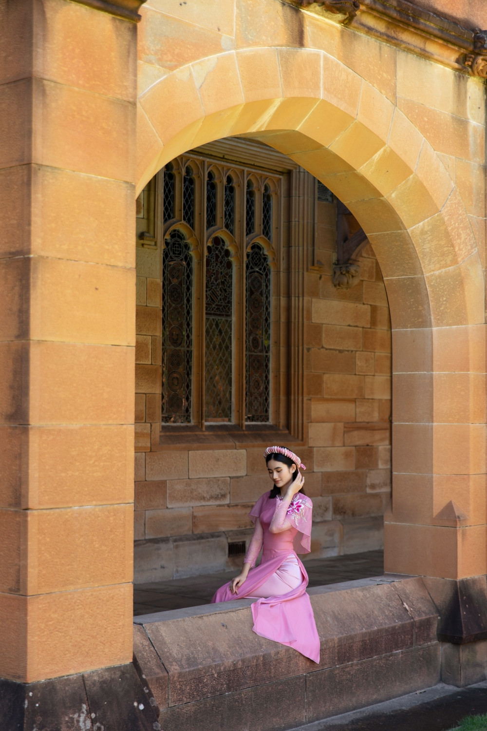 Bộ áo dài mang vẻ đẹp truyền thống xen lẫn hiện đại, điểm tô lên đó là họa tiết hoa Xuân. Miss World Vietnam 2023 Huỳnh Trần Ý Nhi khoe nét đẹp dịu dàng ngay trong khuôn viên trường Đại học Sydney mà cô đang theo học. Ngôi trường này nằm trong Top 20 các trường Đại học tốt trên thế giới.
