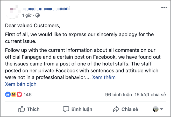 Tiếp theo thông tin về các phản hồi trên trang fanpage chính thức của Hotel *** trong ngày 7/4/2019, chúng tôi đã điều tra sự việc và nhận thấy rằng sự việc xuất phát từ một bài đăng của một nhân viên trong khách sạn chúng tôi. Bài đăng được đưa lên Facebook cá nhân đã không phản ánh đúng tinh thần và lòng hiếu khách của những nhân viên làm trong ngành dịch vụ, khách sạn.