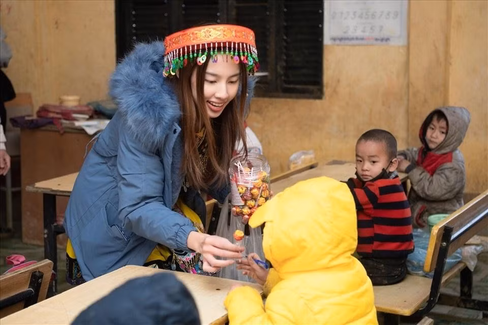 Tại đây, Thùy Tiên tự tin diện trang phục của người H'Mông, nhiệt tình ca hát, giao lưu cùng người dân. Bên cạnh đó, nàng hậu cũng mang rất nhiều phần quà và bánh kẹo để tặng các bạn nhỏ.