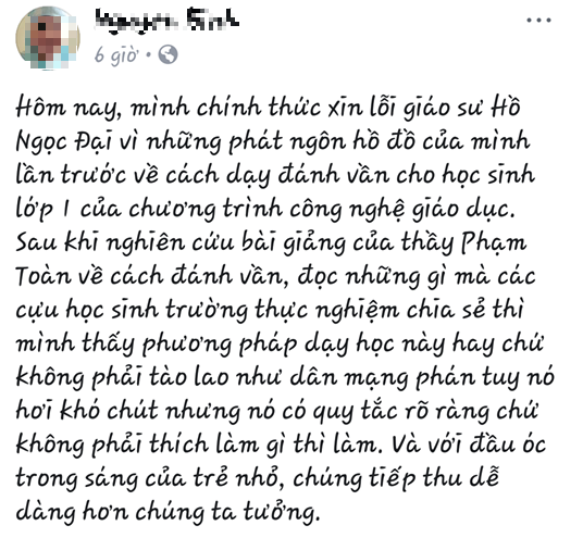 “Hôm nay, mình chính thức xin lỗi giáo sư Hồ Ngọc Đại vì những phát ngôn hồ đồ của mình lần trước về cách dạy đánh vần cho học sinh lớp 1 của chương trình công nghệ giáo dục. Sau khi nghiên cứu bài giảng của thầy Phạm Toàn về cách đánh vần, đọc những gì mà các cựu học sinh trường thực nghiệm chia sẻ thì mình thấy phương pháp dạy học này hay chứ không phải tào lao như dân mạng phán tuy nó hơi khó chút nhưng nó có quy tắc rõ ràng chứ không phải thích làm gì thì làm. Và với đầu óc trong sáng của trẻ nhỏ, chúng tiếp thu dễ dàng hơn chúng ta tưởng… Em xin lỗi giáo sư Hồ Ngọc Đại vì những phát ngôn tào lao về phương pháp dạy học của giáo sư khi em chưa hiểu về phương pháp này và em ước gì chương trình thực nghiệm của thầy được nhân rộng đại trà” - Facebook Nguyen Binh viết.