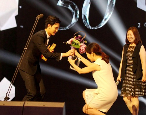 Khi Kim Soo Hyun lên nhận giải ở Baeksang 2014, MC Đài Loan Đào Tinh Oánh đã làm một chuyện không giống ai. Cô quỳ xuống tặng hoa cho Kim Soo Hyun vì quá hâm mộ anh.