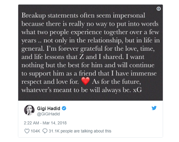 Sau đó không lâu, Gigi Hadid cũng phản hồi lại người hâm mộ trên tài khoản Twitter của mình: “Sau hơn hai năm bên nhau, quả thật cũng khó nói rằng đây sẽ là chuyện của riêng chúng tôi. Tôi luôn cảm thấy hạnh phúc với tình cảm và quãng thời gian khi bên cạnh Zayn. Mong rằng mọi điều tốt đẹp sẽ đến với anh ấy và tôi luôn sẵn sàng giúp đỡ, hỗ trợ khi anh cần. Còn về tương lai, chuyện gì đến rồi cũng sẽ đến. Gigi”.