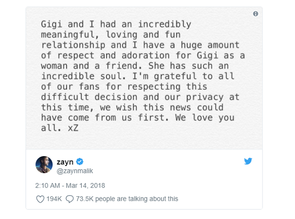 Những tưởng đây là câu chuyện tình yêu đẹp không có hồi kết, thì bất ngờ Zayn đã đăng tải một đoạn tin nhắn lên trang Twitter: “Gigi và tôi đã trải qua một mối tình vô cùng đẹp và ý nghĩa, đặc biệt hơn, tôi luôn nhận được sự yêu mến và tôn trọng từ cô ấy. Cô ấy có một tâm hồn vô cùng đẹp. Quả thật, đây là một quyết định vô cùng khó khăn và tôi cảm thấy rất biết ơn khi các bạn tôn trọng sự riêng tư của chúng tôi. Mong rằng các bạn có thể đón nhận thông tin này từ tôi đầu tiên. Yêu tất cả các bạn”.